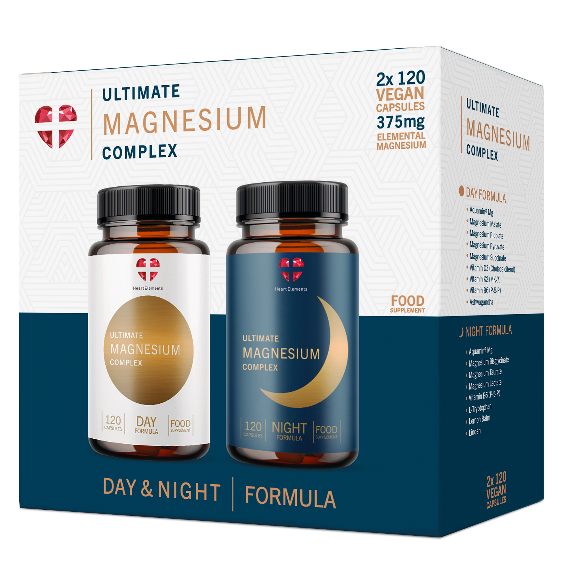Day Formula: Aquamin® Magnesiumhydroxid (370 mg, davon Magnesium 122,1 mg)*, Magnesiummaltat (350 mg, davon Magnesium 39,6 mg)*, Magnesiumpidolat (60 mg, davon Magnesium 5,1 mg)*, Magnesiumpyruvat (60 mg, davon Magnesium 5,4 mg)*, Magnesiumsuccinat (60 mg, davon Magnesium 10,2 mg)*, Ashwagandha (Withania somnifera) Wurzelextrakt (40 mg, Withanolide 5 %), Vitamin B6 (Pyridoxin-5'-phosphat) (2 mg)**, Vitamin K2 (70 µg)***, Vitamin D3 (Cholecalciferol, 25 µg = 1 000 IU)****, vegane Kapsel (HPMC).
